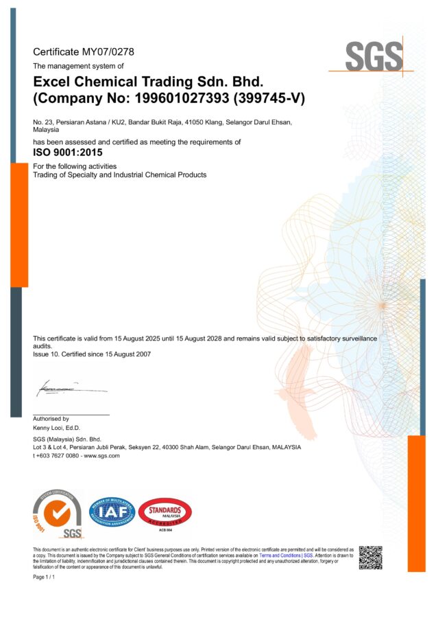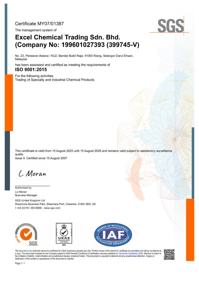 As an ISO 9001:2015 accredited company, Excel Chemical works hard to ensure that our company internal operations support our objectives to achieve high levels of customer service. We understand that our customer needs and expectations change and only by continually reviewing our process for improvement can we always remain ahead of our competitors.